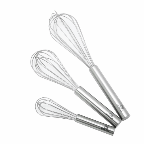Explora el juego de 3 batidores, fabricados en acero inoxidable y disponibles en 3 medidas distintas. Ideales para tus preparaciones culinarias, garantizando resistencia y eficiencia en cada uso.